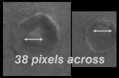 A width of 38 pixels at 4.47m per pixel yields a diameter of 169.86 meters or