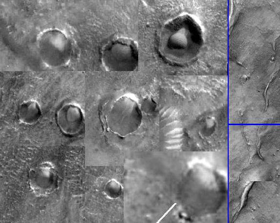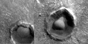 a number of interesting questions. Both craters appear to have large spherical objects contained within their respective boundaries. On the left side (M1501228d)this sphere appears as if it is rising from beneath the surface of Mars like some gigantic egg or puffball. One can clearly see the crennelated edge of the crater's overhanging lip and the associated shadows cast by it. On the right side (M1501228a)we would seem to see a similar object, raised somewhat further above the crater floor. Note the illuminated upper right side and shadowed lower left side. This is indicative of a raised spherical structure. Craters with domes in them. Enormous domes!