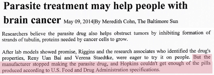 Biologists have found that cancer cells are cells in which the damaged DNA code results in the activation of the telomere, causing it to regrow. The hayflick limit becomes infinite. The mutation makes the cell essentially immortal! Cancer does its damage by outliving and outnumbering the normal cells. The fight against cancer has been one of isolation and selectively poisoning the cells. When cancer cells have integrated themselves in vital tissues, this becomes a major problem. Often, surgical attacks of cancerous tissue seems to stimulate their growth even more, resulting in a temporary relapse with regrowth. Likewise, chemotherapy and radiation are not selective enough to protect healthy cells and their method of death is toxic. Mebendazole is different. It doesn't kill the cells with poison. It specifically prevents the cell from reproducing. What has Big Pharma done? Mebendazole was first synthesized by Janssen Pharmaceutical (later bought by Johnson & Johnson) in 1968. Its value as an anti-worm medicine was recognized and by 1972 mebendazole was being marketed under the name Vermox. Because the prescribed use was eliminating parasites it was inexpensive and widely used. The selective toxicity of mebendazole to cancerous cells had not yet been discovered.