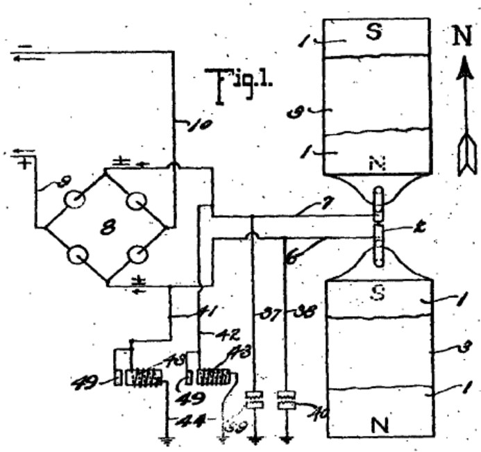 figure consists of horseshoe magnets 54, 55, one facing north and the other