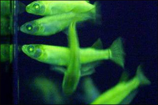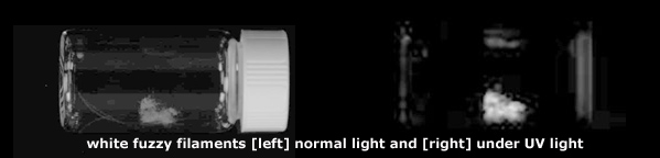 The FBI keeps an extensive catalog of threads, hair and fiber for forensic analysis. With just one thread, for example, they can match the year and model of automotive carpeting, or the manufacturer of a particular item of clothing. But when the Morgellons specimens were submitted to the FBI Forensic Lab and examined they could not be matched! The next step was to determine the composition of the fibers. What were they made from? Morgellons fibers all have one thing in common -- they appear to originate in the skin lesions of their victims. But individually they are quite different in both appearance and composition. There are fuzzy white fibers, sometimes called "cotton balls", that are found growing on top of the skin lesions. Then there are the colored fibers or threads, usually pink, blue or black, that are found under the skin -- even in the surrounding healthy tissue -- and often poke through the lesions. Then there are clear fibers that have a small golden bulb on the end. The white fuzzy fibers or cotton balls were found to be fluorescent. This means that they glow when exposed to ultraviolet light. Since no human cells have fluorescent properties this was quite a surprise. ![]() Scientists have observed that certain marine organisms like jellyfish have the ability to glow in the dark, or fluoresce. This property has advantages for organisms that live deep under the water where there is little sunlight. By using a procedure called Trans-genetics, the DNA from jellyfish has been artificially inserted in the genetic information of other organisms, causing them to glow. Below are examples of trans-genetic goldfish and pigs. The fluorescent properties are spliced into certain genes to enable scientists to "tag" these genes and better understand their function.