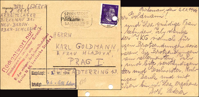 ![]() Prisoners of the camps were occassionally well fed and clothed for days at a time so that promotional photos could be taken of them enjoying the cinema, playing ball, listening to opera and watching plays. These would be published in newspapers, showing that relocating to the camp was both temporary and pleasant... no need to be afraid when the SA come for you... just cooperate... Another marketing scheme was named Arbeitslager Briefaktion (Operation Mail). Upon arriving in Auschwitz, the victims were required to write postcards or letters to home indicating that their resettlement was fine and they were in good health. [below] All these cards had the same return address: Arbeitslager Birkenau, bei Neu-Berun, Oberschlesien.