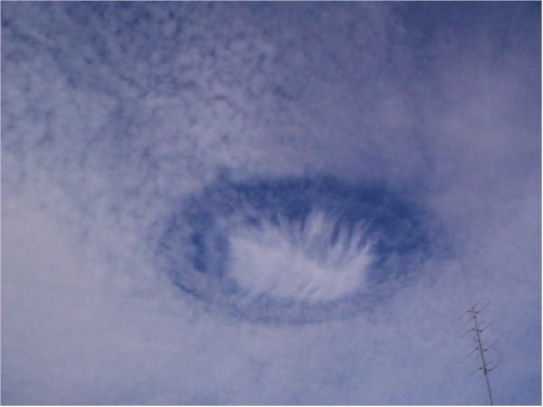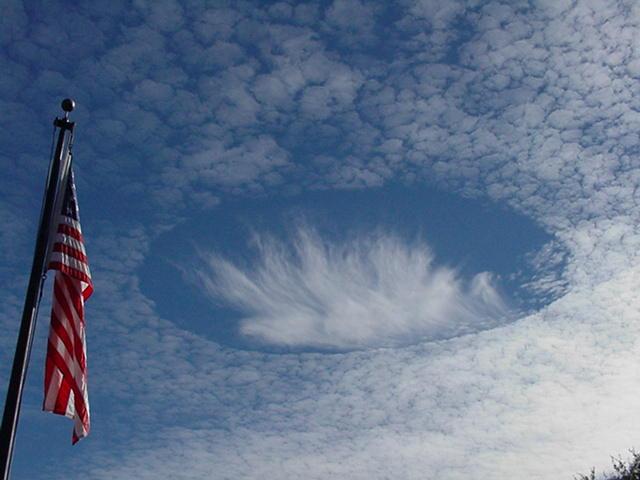 But "sky" circles? Anyone who can answer, please contact myristicin@hotmail.com COMMENTS Mysterious Clouds Produced When Aircraft Inadvertently Cause Rain or Snow According to an article in ScienceDaily, when turboprop and jet aircraft climb or descend under certain atmospheric conditions, they can inadvertently seed mid-level clouds and cause narrow bands of snow or rain to develop and fall to the ground, new research finds. Through this seeding process, they leave behind odd-shaped holes or channels in the clouds, which have long fascinated the public. The key ingredient for developing these holes in the clouds: water droplets at subfreezing temperatures, below about 5 degrees Fahrenheit (-15 degrees Celsius). As air is cooled behind aircraft propellers or over jet wings, the water droplets freeze and drop toward Earth. "Any time aircraft fly through these specific conditions, they are altering the clouds in a way that can result in enhanced precipitation nearby," says Andrew Heymsfield, a scientist with the National Center for Atmospheric Research (NCAR) and lead author of a new study into the phenomenon. "Just by flying an airplane through these clouds, you could produce as much precipitation as with seeding materials along the same path in the cloud." Precipitation from planes may be particularly common in regions such as the Pacific Northwest and western Europe because of the frequent occurrence of cloud layers with supercooled droplets, Heymsfield says. The study, which addresses longstanding questions about unusual cloud formations known as hole-punch or canal clouds, is being published this month in the Bulletin of the American Meteorological Society. It was funded by the National Science Foundation, NCAR's sponsor. In addition to NCAR, the research team included scientists from Colorado State University and the University of Wyoming, as well as a retired cloud physicist. Punching holes in clouds Across the world, sightings of blue-sky holes piercing a cloud layer have triggered bemusement and speculation. A front-page feature on Yahoo! carried the headline "A Halo over Moscow" after photos emerged of just such a hole in October 2009. As far back as the 1940s, scientists have wondered about the causes of these clouds with gaps seemingly made by a giant hole punch. Researchers have proposed a number of possible aviation-related causes, from acoustic shock waves produced by jets, to local warming of the air along a jet's path, to the formation of ice along jet contrails. Indeed, the earliest observations implicated jet aircraft, but not propeller aircraft, as producing the holes. Researchers in the 1980s observed that propeller aircraft could transform supercooled droplets into ice crystals, and experiments were launched in the 1990s to characterize the phenomenon. But scientists had not previously observed snow as it fell to the ground as a result of aircraft until Heymsfield and his colleagues happened to fly through some falling snow west of Denver International Airport with an array of instruments. While the research team did not notice anything unusual at the time of their 2007 flight, a subsequent review of data from a ground-based radar in the area revealed an unusual echo, indicating that the band of precipitation had evolved quickly and was unusually shaped. "It became apparent that the echo had evolved in a unique way, but I had no satisfactory explanation," says Patrick Kennedy, a Colorado State University radar engineer who spotted the unusual readings and helped write the study. Piecing together clues Heymsfield and Kennedy went back through data from their aircraft's forward- and downward-viewing camera. They noticed a hole in an otherwise solid deck of altocumulus clouds in the forward imagery, as well as a burst of snow that extended to the ground. Since the hole was oriented in the same direction as the standard flight tracks of commercial aircraft in the region, Heymsfield surmised that a plane flying through the cloud might have somehow caused ice particles to form and "snow out" along its path, leaving a canal-shaped hole-punch cloud behind. A subsequent review of flight track records from the Federal Aviation Administration revealed that turboprop planes operated by two airlines flew close to the hole-punch location, following a standard flight path that produced the subsequent band of snow. Snow crystals began falling about five minutes after the second aircraft flew through the cloud. The snowfall, in a band about 20 miles long and 2.5 miles wide, continued for about 45 minutes, resulting in about two inches of snow on the ground. The researchers also examined data from onboard spectrometers that profiled the snowflakes within the band of snow beneath the hole punch. These plate-shaped crystals showed evidence of riming (accumulation of liquid water), whereas ice particles elsewhere in the cloud showed little or no riming. "This tells us that the aircraft literally 'seeded' the cloud just by flying through it," Heymsfield says. The cloud layers outside Denver contained supercooled droplet -- particles of water that remain liquid even at temperatures as low as -35 degrees Fahrenheit (about -34 degrees C). When a turboprop plane flies through such a cloud layer, the tips of its propellers can cause the air to rapidly expand. As the air expands, it cools and causes the supercooled droplets to freeze into ice particles and fall out of the clouds as snow or rain. The research team conducted additional studies into the cooling over the wings of jet aircraft, thereby accounting for earlier observations of the impact of jets. Jet aircraft need colder temperatures (below about -4 to -13 degrees F, or -20 to -25 degrees C) to generate the seeding effect. Air forced to expand over the wings as the aircraft moves forward cools and freezes the cloud droplets. "This apparently happens frequently, embedded in the cloud layers," Heymsfield says. "You wouldn't necessarily se
