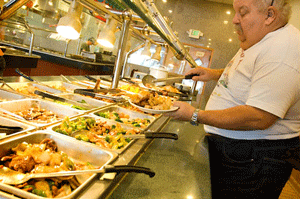 In another experiment, people who were invited to do a cookie taste test ate twice as many cookies or candy after seeing someone who was overweight. So did the Ding Ho restaurant make a bad business decision when they didn't hire Rose? That depends on whether or not they offer a buffet. Temples of overeating In his book, Mindless Eating: Why We Eat More Than We Think, Brian Wanink quotes an recent study conducted by Cornell University that observed differences in the way overweight people react to Chinese buffets. He found that overweight individuals sat 16 feet closer to the buffet, faced the food, used larger plates, ate with forks instead of chopsticks, and served themselves immediately instead of browsing the buffet to see what was available [2].