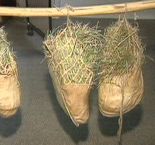 *Two shoes. When he was discovered, the Iceman was wearing only his right shoe. They were made of various animal skins: bearskin soles, deerskin insteps, and chamois/cow/calf/lindenbark uppers. The uppers were worn with fur on the outside and laced up. Dried tree bark (lime bast) was also stuffed inside the shoes to keep his feet warm. Although these are the oldest "shoes" ever found, a pair of 10,000-year-old slippers was discovered in Oregon.