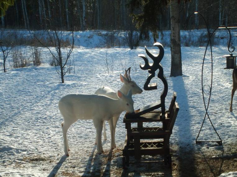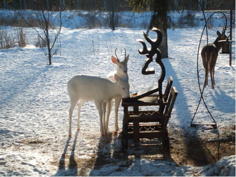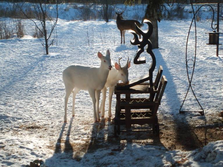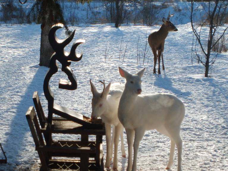 I am part Lakota, so I know an omen when I see one. The following was copy/pasted from an email "pass-around" I received: Behind the Gray Rock Cafe in Grayling, Michigan , Tim Gillette made the deer feeder with the 'Browning' logo. These twin albinos have been coming into the back of Gray Rock Cafe since they were fawns in 2006. We have been trying to capture a digital picture of them for awhile, but they arrive at dusk, (or even later), and the photos don't turn out. However, on Friday, (about 10 AM), they arrived. It was a beautiful morning, and they knew it was time for their photo op.
