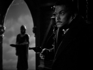 During that same year, Welles offered one of his most charismatic performances as Harry Lime in Carol Reed's classic thriller, The Third Man. No stranger to controversy or artistic espionage, he had earlier been considered a communist by the FBI for his persistent liberal writings and speeches. For The Third Man, Welles assumed the identity of an utterly charming swine, proliferating the ugliest drug trafficking in Europe. Believing Lime dead, an old friend (Joseph Cotten) is consumed by moral outrage in learning the trouble with Harry. Discovering the chaotic chameleon still very much alive, under Reed's breathtaking staging, Holly pursues Harry in righteous indignation and with murderous intent...all to the accompaniment of the withering zither score by Anton Karas.