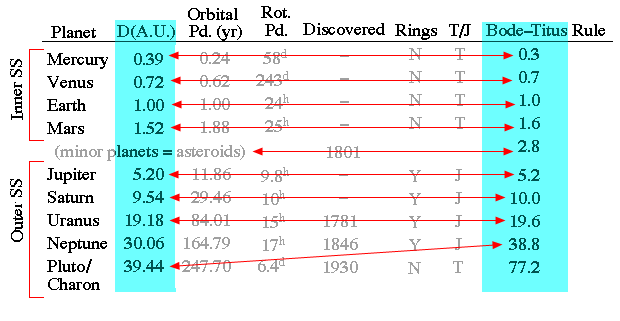 The Bode-Titus law is an empirical rule giving the approximate distances of planets from the Sun. It was first announced in 1766 by the German astronomer Johann Daniel Titius and only popularized, from 1772, by his fellow countryman Johann Elert Bode. The rule may be given as follows: Write down the sequence 0, 3, 6, 12, 24, etc. To each number add 4. Divide each result by 10. Of the first seven answers (0.4, 0.7, 1.0, 1.6, 2.8, 5.2, 10.0), six closely approximate the distances from the Sun, in astronomical units (AU's, the distance between the Earth and the Sun), of the six planets known when Titius devised the rule: Mercury, Venus, Earth, Mars, Jupiter, and Saturn. ![]() At about 2.8 AU's from the Sun, between Mars and Jupiter, the asteroids (sometimes called minor planets) were later discovered. The rule also holds for the seventh planet, Uranus, which lies at about 19 A.U. Bode's law fails for the eighth planet, Neptune. However, Pluto/Charon, the ninth planet from the Sun, is at a distance (39 AU's) roughly equal to that given by the rule for the eighth planet. |
