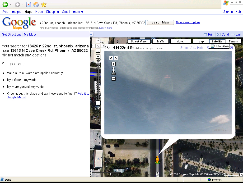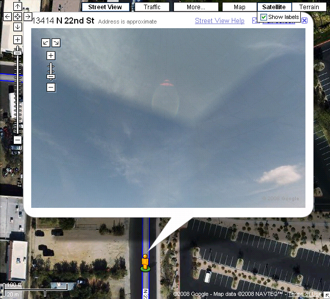 Try it yourself...go to google maps...use this address or one nearby if you prefer...13428 N 22nd St., Phoenix, Arizona...zoom.....click on street view...scroll up to the sky. There it is, whatever it may be. I'm not sure how long it will be there because I do know they update the images every so often., Try different locations around Phoenix or the World for that matter and if you find anything similar, send it to Viewzone if they want them, personally, I've seen all I need to see.
