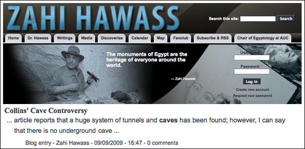 Egyptian authorities try to hide the cave discovery According to Collins, "Dr Hawass [Secretary General for Egypt's Supreme Council of Antiquities] actually denied the existence of the caves. He has done this publicly. Why he has done this is a matter of debate. Fifteen months later, bowing to the inquiries made by the press and Egyptian scholars, Dr Hawass confirmed that he has ordered an all-Egyptian team to explore the tomb at the center of the "controversy". Controversy? How could a discovery on such a scale be controversial?