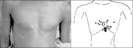 [right:] The circles show the principal shotgun wounds on Maha Ram, drawn from the autopsy report of the deceased. Many more examples can be found in Birthmarks and Birth Defects by Dr. Ian Stevenson.