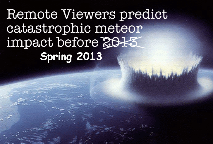 Back in 2008 some predictions were made by a team of the top, military trained "remote viewers" -- each with over a decade of successful service. Lyn Buchanan from US Army Intelligence and Glenn Wheaton, of US Special Forces participated in a project run by Farsight Institute originally designed to detect minute climate changes at selected targets around the globe. Instead of climate change, the remote viewers saw a huge meteoric impact in the ocean with devastating tidal waves and volcanism. All this happening by 2013.