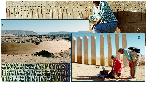 [A]- The mysterious writing on the exterior wall is examined. [B]- A team from the University of Calgary using ground penetrating radar. [C]- A view of the exterior of the oval wall that surrounds the Temple. [D]- One of several bronze plaques that appear to be a type of pre-cast, movable type.