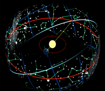 Figure 6: The Sun orbits around Sirius, and as it does so the backdrop of stars forming the Zodiac constellations change location. However the location of these seasons occur at the same position within the Earth's orbit around the Sun.