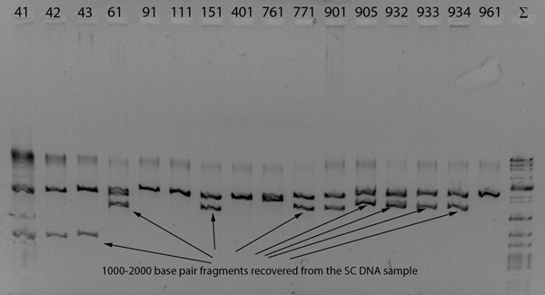 Now, in 2010, there have been many improvements in the recovery process, and those improvements have been applied to the Starchild skull with the stunning result you see below. This is a gel sheet that shows a clear recovery of its nuclear DNA, which could not be done in 2003.