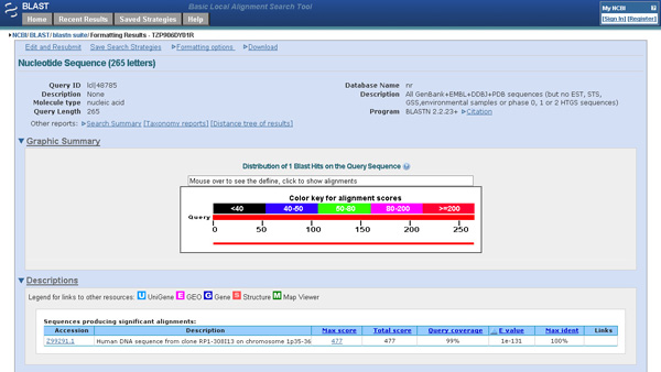 For many species, humans included, there are already nucleotide sequences covering entire genomes. Therefore, sequences from the Starchild's DNA can be directly compared against this vast database to look for any matches. In one such comparison below, you see the text below the blue line at the bottom (if you can read it, sorry it's so fuzzy) that 265 base pairs (a good length) of recovered Starchild nuclear DNA matches perfectly with a gene on human chromosome 1. This verifies beyond any degree of doubt that some of the nuclear DNA seen in the gel sheet is from a human being.