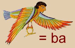 The ba was seen as a human-headed bird hovering over the deceased or exiting the tomb in the hieroglyphics, and was the part of the soul that could travel between the worlds of the living and the dead.