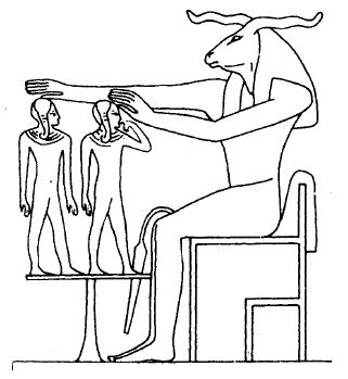Above The creation of man on a potters wheel. The god Khum forming the future king with his right hand and the king's ka with the left on the potters wheel. Note that the ka points with its left hand (controlled by the Right Hemisphere) to its mouth, indicating its Right Hemisphere's bicameral verbal function. [On a monument of Amenhotep III (1405 - 1370 BC.) at Luxor.