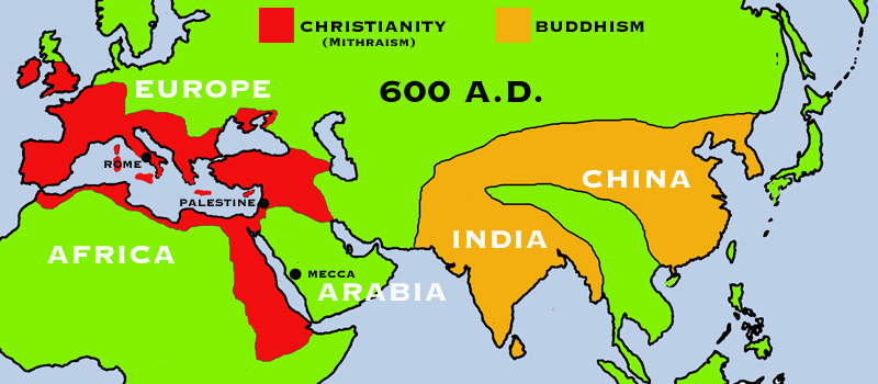 -- Prophet Muhammad (peace and blessings of God be upon him) Setting the stage for Islam: 600 AD By 600 AD, just 500 years after the life of Jesus, Europe is in chaos. The original teaching of a fatherly god who promoted brotherly love and compassion has been replaced by a political system with made up doctrines, dogmas, rules and sin, all resulting from Paul's Mithraic influence. Just about everywhere there are wars and conflicts. The citizens live in squalor under the oppression of local kings. Literacy and education are confined to Christian monasteries and the very rich. The original Jesus teachings are all but extinguished by the Vatican. Europe is entering what will be called The Dark Ages. In Asia, the teachings of Buddha have transformed and unified the people wherever they spread. Three distinct flavors of Buddhism are practiced at this time but all adhere to the Four Noble Truths and the Eightfold Paths. Without defining a god, Buddhism is practiced alongside the reverence for local deities and traditions. It first supplements, but later replaces the older traditions through its effectiveness. Buddhism continues to spread the promise of reincarnation, the laws of karma and the tranquility that comes from practicing non-attachment. By 600 AD, trade along the famous Silk Road had spread Buddhism all the way to the Pacific. The benefits of a unified system of belief and of an effective system for regulating the selfish proclivities of consciousness were being felt in both Europe and Asia. Left out of this progress was the desert land between -- the Arabian Peninsula (see the map below).