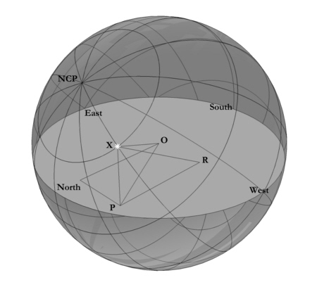 At the same time (the end of 2007) I was struggling with the geometry of projection. It was proving impossible to provide a geometrical method to compensate for the orientation of the site around 50° east of north without resorting to trig tables, and I wanted to show how the stars could be plotted mechanically. The orientation of the site towards the longest day of the year, the summer solstice, lends weight to the idea that it was intentionally aligned on the event, but the association is tenuous for several reasons, none least of which being the tendency for the event to move left and right according to the Earth's changing angle of tilt. Following a dialogue with a professor in astronomy I decided to look at the problem from a completely different angle, literally, at which point everything fell into place. Not only was the geometry problem solved, there was also an explanation for the positions of the Trilithons within the Sarsen circle in providing a permanent record of the Moon's northern and southernmost standstills.