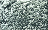 [Above:] A micrograph of a clump of prostate cancer cells. The bluey-green cells are actively growing, whereas the pink ones are in the process of dying by programmed cell death (apoptosis). Many factors are involved in the development of cancers, most of which ultimately have an effect on different sets of genes within the cell. Some of these genes control growth and others programmed cell death. When a group of cells have mutations that tell them to divide faster than they are told to die, cancer can result. (Colour-enhanced scanning electron micrograph by Dave McCarthy and Annie Cavanagh.)