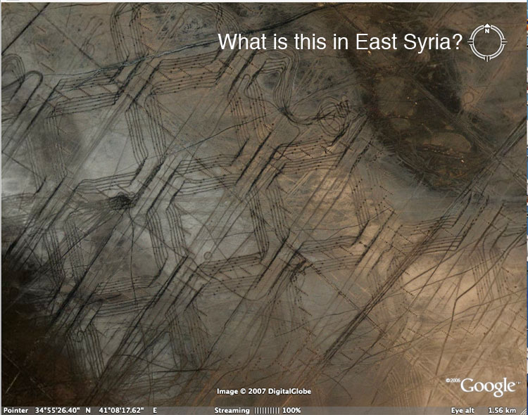 A reader sent this image from the google satellite photo collection showing a very odd arrangement of large (100 ft) rectangles in the desert.
