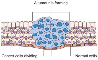 As might be expected, the fetus enjoys abundant telomerase. The surprise is that most of the telomerase making genes are turned "off" after birth. Human cells have their longest telomeres at birth, diminishing with each copy they produce and providing a finite number of potential replcations. (the Hayflick limit) There are some specialized cells that continue to produce telomerase after birth. Tissue like the lining of your mouth and your digestive and immune system need to make many copies to repair the daily natural assault from the environment. But there is another kind of cell that manages to turn "on" the telomerase production, so much so that it becomes virtually immortal -- cancer. The Cancer Problem Usually, when a cell makes an error in copying itself, the error will prevent the cell from duplicating itself and it dies before making any copies of the error. So the mistake is limited. But with cancer, cells make errors in copying the DNA code and then, somehow, turn "on" the production of telomerase -- allowing them to make unlimited copies of themselves -- making them immortal. The aberrant cells frequently lose their former function, then rapidly reproduce and outlive normal cells. This is the process that creates tumors.