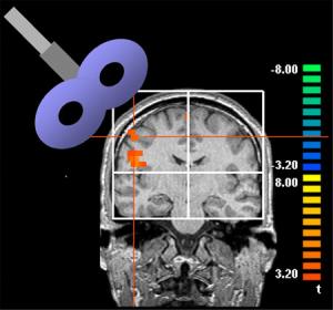 rTMS is applied with an electromagnetic coil in the shape of a figure-eight, placed on the scalp directly over the targeted portion of the brain. Short bursts of a strong magnetic pulse stimulate electrical currents within. Sensory input from each region of the body is represented on the surface of the brain, and the location of any region--in this case, the right index finger--can be mapped to allow precise targeting of the rTMS. The authors adjusted the strength of the magnetic field to just below that which triggered a sensory response in the finger, and then applied intermittent pulses of stimulation over the course of about ten minutes.
