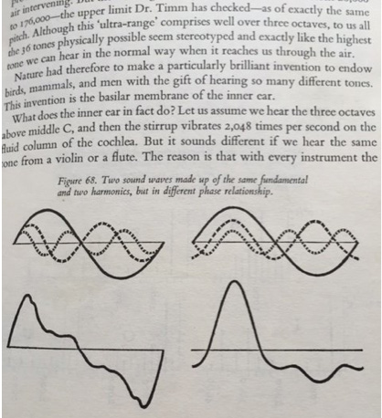 Let us draw up a fundamental vibration with its first and second harmonic overtones [1:2:3] ... if we then shift the phase relationship, we get a totally different course of the combined curve; that is, of the pressure course which is apparently effective in the final analysis. When looking at both curves, one might suppose that in the two cases we should hear two sounds that are just as different. But in fact our ear does not notice any difference. (Dröscher, 1969, p. 168)