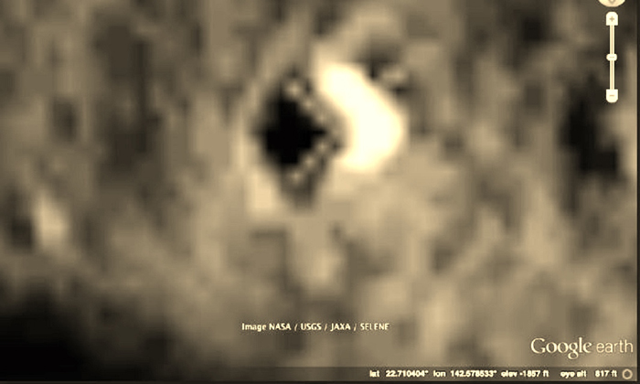 LADEE's Ultraviolet and Visible Light Spectrometer (UVS), which determines the composition of the lunar atmosphere by analyzing light signatures of materials it finds, detected something very large and very different from anything "lunar." The object was located in a crater which is about the size of downtown Chicago. It was L-shaped, like a wedge, gave off no radio signals but did appear to have seven areas where light of some type was either being emitted or being reflected. Thanks to LADEE having found the object, NASA knew where to look and sent the LROC to grab high-resolution images. Those images are classified, but low-resolution images from LROC made it out to the public via routine LROC publication. They ended-up as part of Google Moon where intrepid users found the object. Here now, the low-resolution images of an enormous object, which was tracked by the U.S. Government for millions of miles before it soft-landed on our moon: