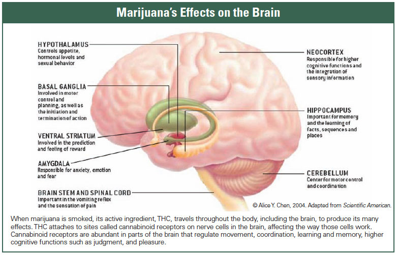 Let's take a look at some of the other research There's a wonderful search engine called "scholar google" where you can access professional and peer reviewed studies on just about any topic. I spent some time looking at studies about cannabis in preparing to write this story. Instead of a plethora of health benefits attributed to cannabis, I found some cutting-edge research -- breaking news -- about some brain changes in important areas as measured with various types of brain scans. I will be telling you about these in this report. With the current popular support for legalized marijuana, cannabis is not only here to stay but expanding legalization will make pot use as common as coffee and cigarettes. Soon many more people will have the observed brain changes that result from cannabis -- and along with it the altered behavior resulting from these affected brain regions. How serious is this? Decide for yourself after you continue reading about how pot gets you high. Here is the latest cannabis study that is just beginning to cause a stir: