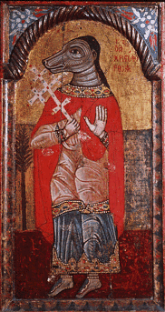 The German bishop and poet Walter of Speyer portrayed St. Christopher as a giant of a cynocephalic species in the land of the Chananeans (the "canines" of Canaan in the New Testament) who ate human flesh and barked. Eventually, Christopher met the Christ child, regretted his former behavior, and received baptism. He, too, was rewarded with a human appearance, whereupon he devoted his life to Christian service and became an athlete of God, one of the soldier-saints. --Wikipedia