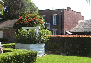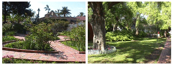 PHOTOS: Left- The rose garden. No spectral cats or dogs visible today, but they've sometimes fought here. Right- Large pepper tree was planted by Anna Whaley. An unknown spirit in a stovetop hat sometimes waits beyond the tree.