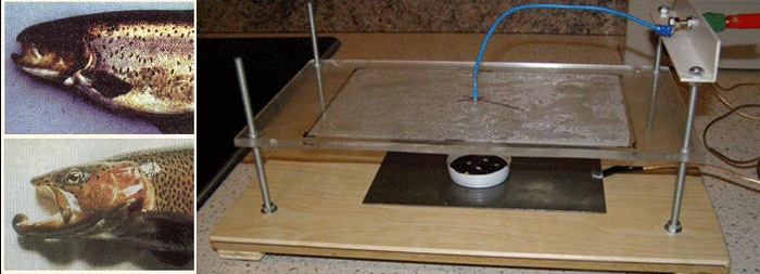 ![]() [Left] Extinct hooked nose trout developed from electrostatic treatment of modern trout eggs. [Right] The apparatus used to administer the electrostatic field to the trout eggs.