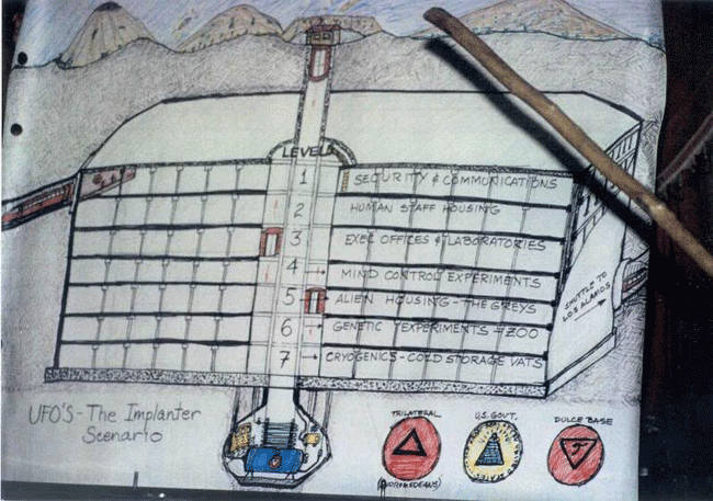 Dulce Base -- under Mt. Archuleta, Dulce, New Mexico. Located close to the Colorado border and situated on the Jicarella Apache Indian Reservation. The town of Dulce is located off U.S. Route 64 population 900-1,700. A small town with one motel and a gas station. The base is located 2.5 miles northwest of Dulce and almost overlooks the town. Joint CIA-Alien base. 95 miles northwest of Los Alamos. Biogenetics Laboratory including but not limited to: Atomic Manipulation, cloning, studies of the human aura, advanced mind control applications, animal/human crossbreeding, visual and audio human chip implantation, abduction and feeding off of humans including children.